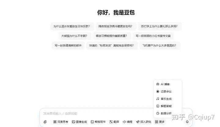 今天打开电脑网页版的豆包,涉及的模块包括“深度思考"、图像生成、帮我写作、翻译、编程、深入研究、ai博客、记录会议、音乐生成、解题答疑、数据分析“等功能。